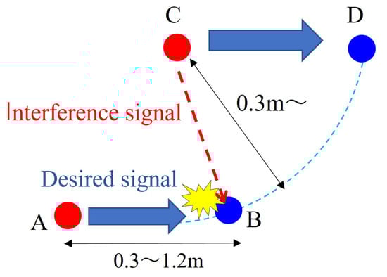 Table 2 determines the distance between the A and B wireless stations, where wireless station C does not interfere as an interfering wave, and hence, the achievable transmission rate between the A and B wireless stations, when the distance from wireless station A to wireless station B, where communication begins, varies from 0.3 m to 1.2 m. For example, when the distance between the A and B wireless stations is 0.3 m, to achieve a transmission rate of 9 Mbps or more, it is necessary to keep the distance between the B and C wireless stations at 1.0 m or more. Therefore, based on these results, in the development of wireless devices for epidemic communication, the transmit–receive range is set to 0.3 m, and the received power at that distance is calculated using Equation (2). Setting the transmit power to = 0 dBm (1 mW) and using d = 0.3 m, f = 2.4 GHz, , and = 0 dB, the calculated is dBm. Thus, in the design of wireless devices, communication is designed to start within the range where the RSSI (received signal strength indicator) is within dBm. However, it is assumed that the distance between the B and C wireless stations is at least 0.9 m to obtain the minimum transmission rate.
