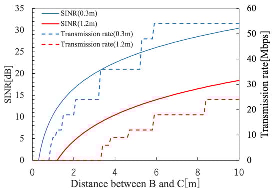 The parameters used in this simulation are the values specified for actual wireless LANs [17]. The conditions under which interference occurs are calculated based on the transmitted and received power using these values and assuming the actual distance based on the drone’s flight position, etc. Therefore, we believe that the scenario created by this simulation is reasonable. The calculated results of the available transmission rates based on the distance between the A and B wireless stations when the distance between the B and C wireless stations, which serve as an interference source, is changed for the previous section are shown in Table 2. Figure 6 illustrates the transmission rates obtained from Table 2 and the corresponding received power for distances between the A and B wireless stations set to the minimum and maximum values of 0.3 m and 1.2 m, respectively.