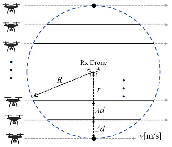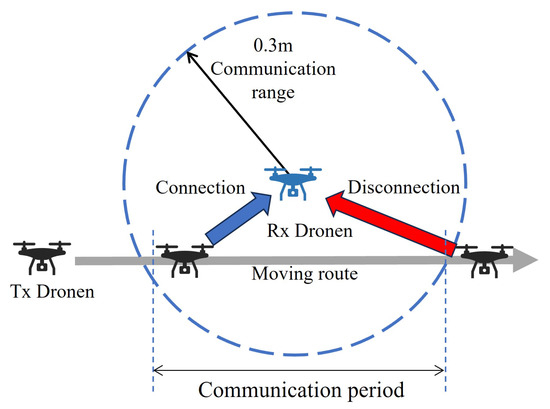 where denotes the radius of the communication range obtained in Section 3.1; we set to 0.3 m. When the moving route of the transmitting station passing through the communication range varies by at evenly spaced intervals, the time spent within the communication range and transferable transmitted data volume is calculated based on the transmission rate. Additionally, R denotes the distance from the center when approaching the center by . v is the moving speed of the drone. To determine the time to pass within the communication range, we calculated the distance through the communication area using the Pythagorean theorem. We attempted this n times and calculated the transmission time when approaching the center of the communication range , transmission rate used during communication b, and amount of data that can be transferred at that time. Next, we determined the average amount of data using the amount of transmission data that can be transferred on each route and number of times N () passed through the communication range.