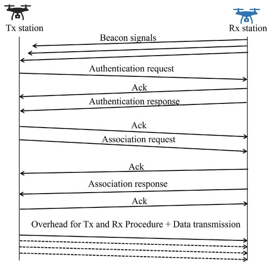 The connection procedure and the sequence of data transmission are illustrated in Figure 8. In this study, the transmitting station uses passive scanning to find surrounding available receiving stations by receiving beacon signals sent by receiving stations for a certain period. Subsequently, as an authentication procedure, the transmitting station sends an authentication request to the receiving station, and the receiving station responds with an authentication response to confirm its availability. Once the authentication procedure is completed, an association request is sent to initiate the connection procedure, and the connection is completed when the receiving station responds with an association response. In addition to these procedures, data transmission and reception involve carrier-sensing procedures and transmission–reception periods as specified in the IEEE 802.11g standard.