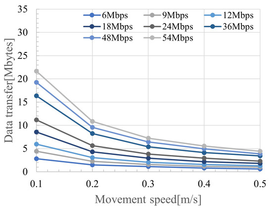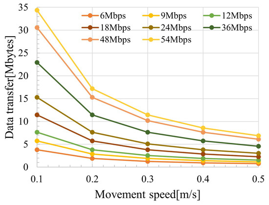 Figure 10 shows the amount of data transferred relative to the movement speed for each transmission rate. The legend of Figure 10 indicates the respective transmission rates, and the x-axis indicates the movement speed of the wireless station. We observed a significant decrease in the transferable data amount when the movement speed changed from 0.1 to 0.2 m/s. In this study, the drone was assumed to capture flower image data of 500 KB, and the amount of data to be transmitted increased each time it passed another wireless station holding data, requiring the ability to transfer up to approximately 10 MB of data. Considering interference waves from the surroundings, transmission at lower rates may occur. Therefore, a drone speed below 0.2 m/s was desirable. The speed of infection (i.e., the rate of spread) of the entire system depends greatly on the number of drones and their speed of movement, but epidemic communication is originally based on a delay method called DTN. Although the physical transport speed (movement speed) of data is not important, a higher transmission rate is desirable when passing each other, increasing the amount of data that can be shared.