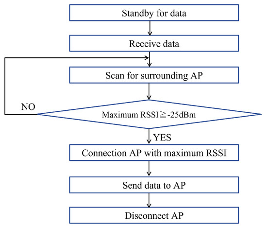 The parameters of the wireless devices were determined based on the analysis in Section 3. The RSSI value for connection was set to dBm, which was measured to achieve a communication range of 0.3 m. First, as shown in Figure 7, the actions and conditions from searching for the receiving station to connecting and disconnecting are explained in the flowchart presented in Figure 11. The STA scans the beacon signals of the surrounding APs, and acquires the SSID and RSSI upon receiving the beacon signal. This information is then passed to Python and saved in a list. The RSSI is compared with dBm, and the AP with the highest RSSI, i.e., the nearest AP, is then searched for. The connection process is then executed. After the connection, the image data are transmitted, and the connection is disconnected when the RSSI falls below dBm or when the transmission of image data completes. This operation can be repeated to transfer data to the destination. The transmission and reception algorithm for epidemic communication was implemented using a Raspberry Pi 3B+ (RasPi) [38] and external wireless device dongle. The RasPi is a low-cost and lightweight single-board computer with communication features such as Wi-Fi and USB ports. Some information on the use of Raspberry Pi 3 Model B+ [39] is as follows. Operating temperature: approximately 60 °C; current consumption: approximately 500 mA; CPU utilization: approximately 8%.