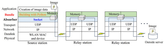 Figure 13 shows the implemented protocol stack. Epidemic communication generally involves a bundle layer that accumulates data. This layer is inserted into the protocol stack above the transport layer and below the application layer. The bundle layer [40] implements a store–carry–forward mechanism in which nodes store data in their own buffers and transfer the data when it becomes available to other connected nodes. Data created in the application layer are converted into variable-length data called a bundle and stored in persistent storage for a long time; when a node is within the communication distance, the data are retrieved from this persistent storage for transfer. This layer enables the accumulation of data, helps handle data corruption during transfers, and retains the data to be transmitted. However, wireless LANs do not have such accumulation functions. Therefore, in this study, the data were pseudo-accumulated in memory using Python, as shown in Figure 13. The data received from the socket function were first reconstructed into an image using Python, and then, saved in memory. Additionally, the data payload size that could be passed from the application and bundle layers to the session layer was 65,507 bytes, which was obtained by subtracting the UDP header (8 bytes) and IP header (20 bytes) from the maximum datagram length of the IP layer, which was 65,535 bytes.