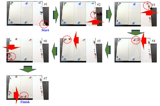 Therefore, although the infection rate decreased, we confirmed that the epidemic communication system operated normally. We fabricated seven wireless devices, as shown in Figure 16. Flower images were first captured, and the operation was confirmed by relaying the data from the source to the destination while transferring the data. A blue LED indicates wireless devices without holding data, and a red LED indicates the state of the wireless devices infected and holding the data. The wireless devices holding the data move according to the red arrows in the figure, and when they approach other wireless stations, their states change from blue to red. This operation was repeated to confirm that all wireless devices were infected and holding the data. As the implementation uses a wireless LAN, the connection time is theoretically longer than that shown in Figure 15, resulting in a decrease in the amount of data that can be transmitted. Therefore, other communication standards must be considered. This implementation also implements IP and UDP protocol stacks, since general-purpose software was used to measure throughput in the experiment. However, actual epidemic communication is the technology for spreading information through infection, and does not require a routing protocol that uses IP, etc., and the specification can work even if the IP and UDP layer layers are removed.