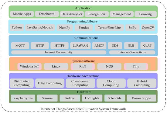 Aspect–component layering, as described in reference [68], is utilized to organize the architecture of an IoT-based kale cultivation system into a coherent structure that extends from the most concrete elements, such as hardware, to the more conceptual components, such as business processes. As illustrated in Figure 1, this architectural design enables a methodical progression in constructing and overseeing the IoT cultivation ecosystem, guaranteeing that every element operates harmoniously to attain maximum plant development and effective farm administration. The diagram depicts a comprehensive framework for a kale cultivation system that utilizes the IoT to optimize indoor plant growth. This structure has been meticulously designed to ensure that all technological components are in unity.