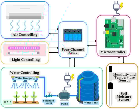 Integrating Internet of Things (IoT) technology into indoor kale cultivation presents significant potential for a paradigm shift and the advancement of organic farming methodologies. Particularly those enhanced by IoT technology, indoor cultivation systems present a promising resolution to those challenges [9,10,11]. IoT technology in precision agriculture enables the exact regulation of growing conditions, including light, temperature, and humidity, which are critical for the kale plant’s growth. By incorporating sensors and actuators into indoor farming systems, IoT technology facilitates automated adjustments and continuous monitoring, guaranteeing ideal growth conditions that may increase nutritional value and yields. In addition, IoT technology enables organic farming to be more traceable and transparent by providing comprehensive data on crop cultivation methods, spanning from sowing to harvest [12]. By leveraging the IoT, farmers can enhance crop quality and productivity while advocating for sustainable and organic farming methods that prioritize consumer health and environmental stewardship [13,14].