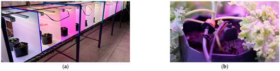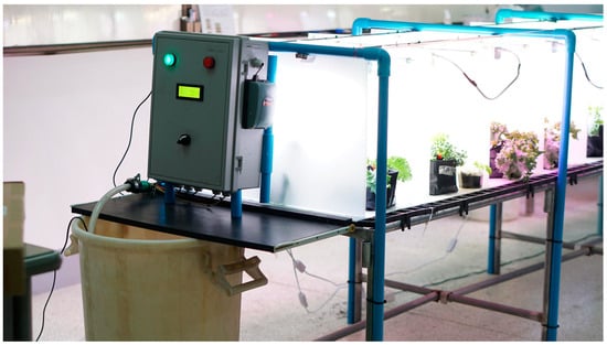 Because of the substantial lighting needs of kale, the plants were illuminated with UV LED lights, automatically controlled by an IoT-based kale cultivation system as previously illustrated in the system architecture of Section 3.1, from 06:00 in the morning to 18:00 in the evening to ensure optimal growth. Daily watering was carried out at 07:00 using an activated water dropper system, which commenced operation when soil moisture sensors indicated that humidity levels had decreased to the desired range of 60–70%. As depicted in Figure 6b, this automated irrigation system ensured that every kale pot obtained adequate hydration. The IoT system played a crucial role in maintaining these optimal conditions, showcasing the innovative technology used in our experiment.