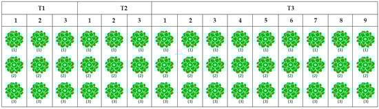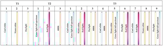 A controlled indoor environment measuring 6 × 5 m was utilized to conduct an experimental analysis of the effects of various lighting conditions on the growth of curly kale in this study. An 18,000 BTU air conditioner was installed in the room to ensure consistent temperature levels. The investigation was structured into three discrete groups: the first group (T1) comprised three experimental sets; the second group (T2) comprised three sets as well; and the third group (T3) contained nine experimental sets for a cumulative sum of fifteen experimental sets. As shown in Figure 4, each set comprised three curly kale plants, with forty-five plants in the experiment. Vinyl partitions measuring 62 cm in width and 60 cm in height were positioned between each row, 30 cm apart, to promote consistency and reduce variances among the sets. The primary objective of the experiment was to assess the efficacy of UV light control in three distinct lighting conditions: kale cultivated using conventional household LED lights, kale cultivated using specialized UV lights designed for indoor plant cultivation, and kale cultivated using a hybrid system of household and LED grow lights. Three household types of LED lights—daylight, warm white, and cool white—and three grow light types—full-spectrum indoor grow lights, indoor grow red lights, and indoor grow lights set to 4000 K—were employed. The configurations mentioned above are elaborated upon in the cited figures, which visually represent the experimental arrangement. Figure 5 and Figure 6a depict the actual surroundings and configurations.