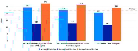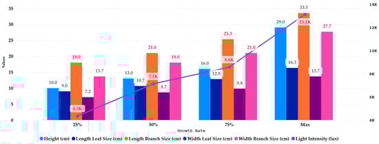 The quantitative evaluation of plant growth involved the measurement of the kale’s height, leaf size, and branch size at three critical growth stages: 15, 30, and 45 days after transplantation, as visually depicted in Figure 7. The data obtained from these measurements analyzed the physical growth responses of the plants in response to different lighting conditions. Additionally, before transplantation, the seedlings’ health and uniformity were evaluated to ensure that the experimental sample was consistent. By employing this thorough data collection method, a thorough examination of growth patterns was possible, and these patterns could be correlated with the controlled environmental parameters. As a result, valuable insights were gained regarding the most favorable conditions for cultivating curly kale indoors.
