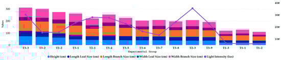 In addition, there were substantial leaf and branch size variations among the experimental groups at the 45-day mark (p-values of 1.59 × 10−11 and 3.61 × 10−9, respectively). The results of this study indicate that the UV LED light parameters impact the plants’ overall growth height, leaf expansion, and branch outgrowth, among other developmental characteristics.