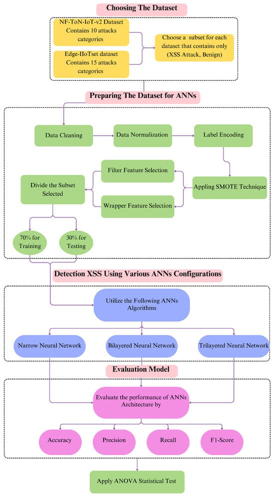 The methodology begins with selecting subsets from the NF-ToN-IoT-v2 and Edge-IIoTset datasets that focus on “XSS” and “benign” categories. The preprocessing steps include data cleaning, normalization, and label encoding. The Synthetic Minority Over-sampling Technique (SMOTE) is applied to address the issue of imbalanced data. Next, both filter and wrapper feature selection methods are used to identify the most valuable features for XSS detection by ANN architectures. The dataset is divided into subsets: 70% for training and 30% for testing. Various ANN classifiers, including Narrow Neural Network, Bilayered Neural Network, and Trilayered Neural Network, are then employed to detect XSS attacks. The performance of these models is evaluated using metrics such as accuracy, precision, recall, and F1-score. Additionally, the ANOVA statistical test is applied to validate the results. This approach demonstrates its effectiveness in enhancing IoT system security and mitigating potential risks by achieving high accuracy in identifying XSS attacks.