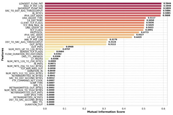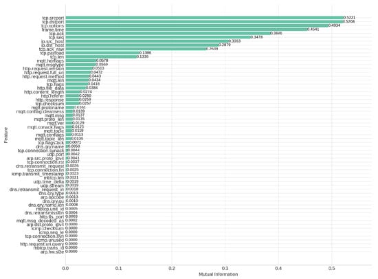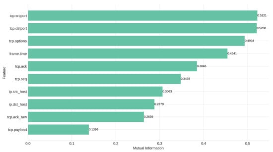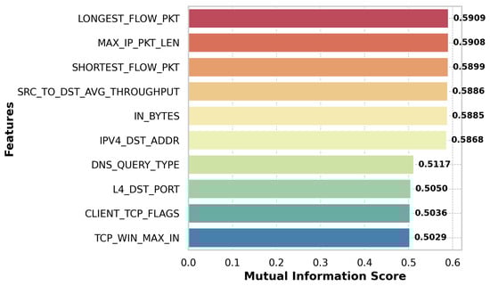The process began with the encoded dataset S, during which the features X and the target variable y were isolated. Following this, for each feature f in X, we computed the mutual information score between f and y using the mutual_info_classif function. We then selected the top ten features with the highest mutual information (MI) scores to ensure an optimal balance between retaining highly informative features and minimizing model complexity. This approach was strategically chosen based on empirical evidence, suggesting that selecting features with the highest MI scores significantly enhances the model’s predictive accuracy while reducing the risk of overfitting. Algorithm 2 illustrates the details of this method. Figure 2 presents the MI scores for all features in the NF-ToN-IoT-V2 dataset, and Figure 3 presents the selected features with the highest MI values. Figure 4 presents the MI scores for all features in the Edge-IIoTset dataset, and Figure 5 presents the selected features with the highest MI values.