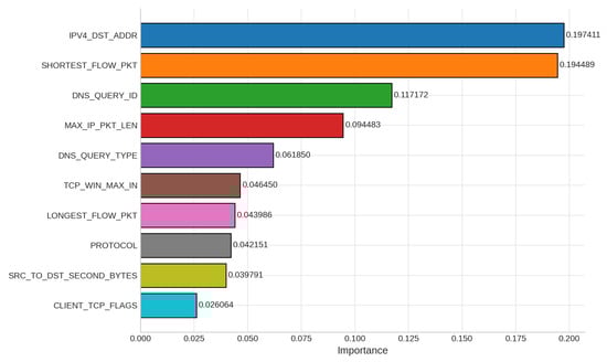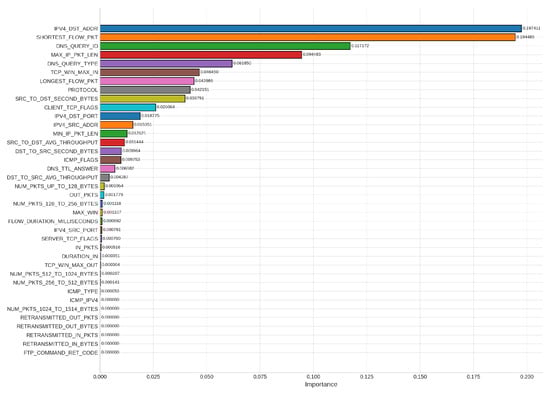 Selected features with the highest feature importance values in the NF-ToN-IoT-V2 dataset.