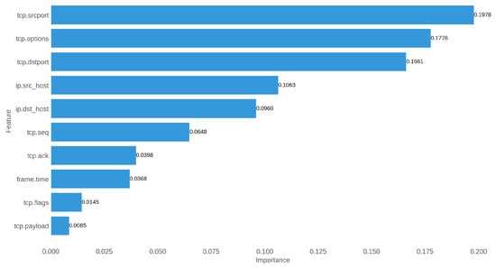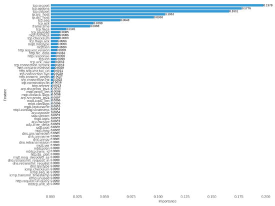 Selected features with the highest feature importance values in the Edge-IIoTset dataset.
