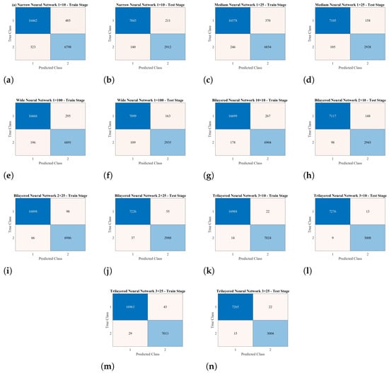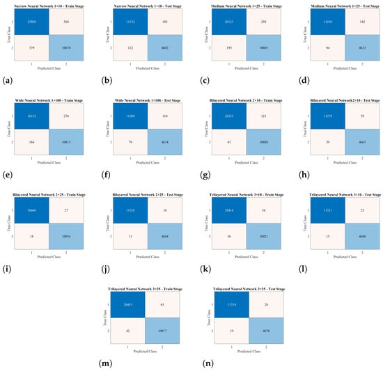 The confusion matrices in Figure 11 show that the Narrow Neural Network 1 × 10 (a, b) achieves 25,808 true positives and 10,670 true negatives during training, but has 568 false positives and 379 false negatives; in testing, it has 11,132 true positives, 4602 true negatives, 183 false positives, and 122 false negatives. The Medium Neural Network 1 × 25 (c, d) improves with 26,133 true positives and 10,805 true negatives during training and 11,180 true positives and 4623 true negatives in testing, with fewer false positives and negatives than the narrow network. The Wide Neural Network 1 × 100 (e, f) shows 26,152 true positives and 10,813 true negatives during training and 11,208 true positives and 4634 true negatives in testing, making the Medium Neural Network 1 × 25 the most balanced single-layer model. For multi-layer networks, the Bilayered Neural Network 2 × 10 (g, h) achieves 26,335 true positives and 10,888 true negatives in training and 11,278 true positives and 4663 true negatives in testing, with low error rates. The 2 × 25 configuration (i, j) presents the best performance with 26,446 true positives and 10,934 true negatives in training and 11,328 true positives and 4684 true negatives in testing. The Trilayered Neural Networks show slightly higher error rates: the 3 × 25 configuration (k, l) has 26,403 true positives and 10,917 true negatives in training and 11,314 true positives and 4678 true negatives in testing, while the 3 × 10 configuration (m, n) achieves 26,414 true positives and 10,921 true negatives in training and 11,321 true positives and 4680 true negatives in testing. The Bilayered Neural Network 2 × 10 offers the best balance of simplicity and performance, achieving superior results in detecting XSS attacks.