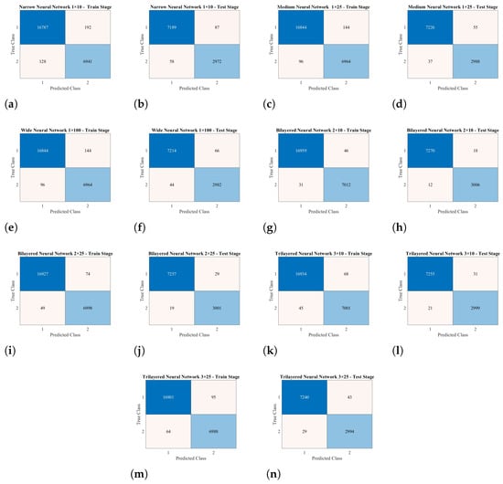The confusion matrices presented in Figure 12 provide insights into the performance of various neural network configurations on the Edge-IIoTset Filtered Dataset. The Narrow Neural Network 1 × 10 (a, b) shows relatively higher error rates, with 16,442 true positives and 6798 true negatives during training and 7043 true positives and 2912 true negatives during testing. The Medium Neural Network 1 × 25 (c, d) improves upon this, recording 16,578 true positives and 6854 true negatives during training and 7105 true positives and 2938 true negatives during testing. The Wide Neural Network 1 × 100 (e, f) further enhances accuracy, with 16,666 true positives and 6891 true negatives during training and 7099 true positives and 2935 true negatives during testing. The Bilayered Neural Network 2 × 10 (g, h) demonstrates exceptional performance, achieving 16,699 true positives and 6904 true negatives during training and 7117 true positives and 2943 true negatives during testing. The 2 × 25 configuration (i, j) shows even better results, with 16,898 true positives and 6986 true negatives during training and 7226 true positives and 2988 true negatives during testing. The Trilayered Neural Networks 3 × 10 (k, l) and 3 × 25 (m, n) perform well but show slightly higher error rates compared with their bilayered counterparts. Overall, the Bilayered Neural Networks, particularly the 2 × 25 configuration, achieve the highest accuracy with lower complexity, emphasizing the importance of considering model complexity in neural network design for security applications.