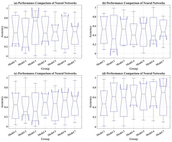 Performance comparison of neural networks’ notched box plot: (a) filter NF-ToN-IoT-V2, (b) wrapper NF-ToN-IoT-V2, (c) filter Edge-IIoTset, and (d) wrapper Edge-IIoTset.