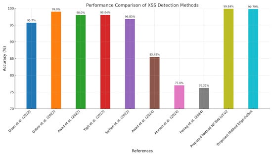 Comparing the detection accuracies of XSS injection attacks with previous studies. References: Duan et al. (2022) [], Gaber et al. (2022) [], Awad et al. (2022) [], Yigit et al. (2023) [], Sarhan et al. (2022) [], Awad et al. (2024) [], Ahmed et al. (2024) [], Ferrag et al. (2024) [].