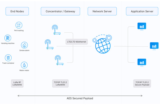 The reference network architecture of the system considered in this paper is derived from the overall architecture in Figure 1. In this architecture multiple end nodes equipped with LoRa transmitters serve as data sources. These end nodes, often spread across a wide geographical area, send data wirelessly to a centrally located LoRa gateway. The LoRa gateway, functioning as a bridge, collects the transmitted data from the end nodes. In the production configuration, the gateway interfaces with a network server. For the purposes of this study, all data received from the gateway is directly written to the filesystem of the Raspberry Pi mounted on the drone and subsequently read for downstream analysis The proposed system consists of a LoRaWAN gateway built on a Raspberry Pi platform which incorporates an iC880A concentrator, that is a high-performance device capable of handling multiple LoRa signals simultaneously, thus enhancing the system’s capacity and efficiency.