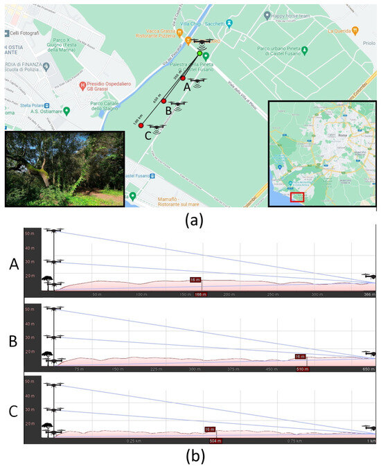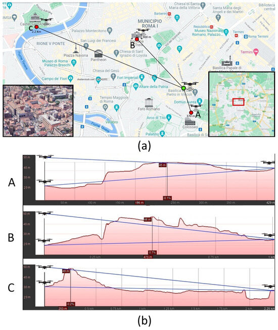 Figure 3. Dense vegetation: (a) aerial view with survey points, a photo taken from ground and the position of area in the red box, (b) terrain profile. - Urban area. Figure 4 provides a visual representation of the spatial distribution of three drone radio modules positioned strategically within the historical center of Rome. These locations were chosen near Castel Sant’Angelo, the Trevi Fountain, and the Colosseum, highlighting the system’s deployment in densely populated urban settings. Due to flight restrictions within the historical center, the drone operated along a strictly vertical trajectory, remaining within the confines of the departure location’s property perimeter. To ensure privacy compliance, all onboard cameras were deactivated during flight operations. Testing in urban environments presented substantial challenges for establishing reliable communication links, even when operating at an altitude of 50 m. The gathered data revealed significant hurdles stemming from both man-made structures and the natural topography of Rome’s historic center. The city’s undulating terrain, characterized by hills and valleys, posed a barrier to signal propagation, complicating the efforts required to maintain consistent communication between the drone and ground stations. Moreover, the presence of dense buildings further exacerbated signal attenuation and interference. These urban conditions underscored the importance of adaptive communication protocols and robust signal processing techniques to overcome obstacles and ensure uninterrupted data transmission. Despite these challenges, conducting tests in urban environments allowed us to evaluate adaptive strategies to optimize communication reliability and efficiency in complex urban landscapes. Such testing is crucial for enhancing the system’s resilience and adaptability, ensuring its effectiveness in urban applications such as emergency response, infrastructure monitoring, and cultural heritage preservation, where reliable communication and data transmission are paramount.
