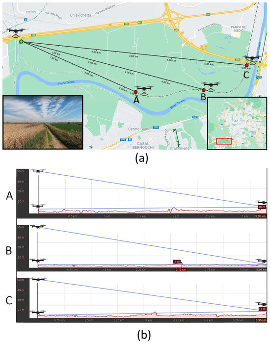 Figure 4. Urban area: (a) aerial view with survey points, a photo taken from ground and the position of area in the red box, (b) terrain profile. - Agricultural area: Figure 5 depicts the strategic positioning of both the gateway and drone radio modules within an agricultural area. This area is primarily devoted to the cultivation of wheat and maize, characterized by wide-open spaces that are devoid of obstructive elements that might interfere with signal transmission. The placement of three survey points along a designated bicycle path, along with the strategically located gateway, was carefully planned to maximize coverage and data collection efficiency. The topography of the surveyed locations is flat, contributing to optimal conditions for signal propagation. Additionally, the vegetation density is small, and natural obstacles are typically under 50 cm in height throughout the entire designated area. This ensures minimal attenuation of signals, thereby facilitating robust communication between the drone radio modules and ground-based equipment. The testing in this environment offers distinct advantages for assessing the system’s performance in rural and crop cultivation settings. The absence of tall structures and the uniform terrain simplify signal management and data transmission processes, highlighting the system’s adaptability and reliability under favorable environmental conditions. These tests provide valuable insights into optimizing communication protocols and sensor deployment strategies tailored to agricultural monitoring and management applications.