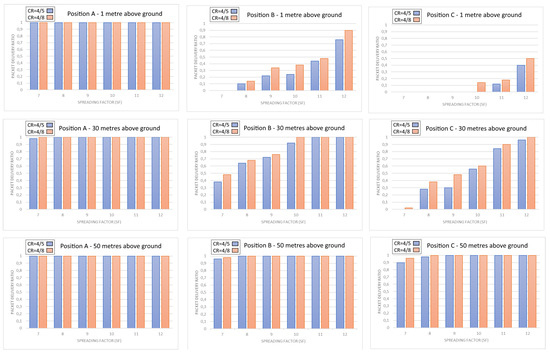 LoRa was originally designed for extensive coverage, boasting theoretical ranges of up to 15 km in suburban areas and 5 km in urban settings. The measurements conducted within densely vegetated scenarios (see Figure 6) provided different results. Specifically, it was observed that the effective range at a height of one meter fell substantially short of theoretical predictions. Despite utilizing a spreading factor , the drone radio module in position ‘A’ at 350 m away was successfully reached, whereas no signal was received from the drone radio module in position ‘B’ at 650 m. This notable reduction in range can be attributed to the challenging propagation conditions that are inherent to densely wooded environments. Despite the inherent robustness of the CSS modulation technique, the tests underscored LoRa’s susceptibility to signal degradation due to electromagnetic absorption by natural obstacles. The utilization of drones for testing provided valuable insights, demonstrating that elevating the onboard gateway’s height resulted in significant improvements in packet reception quality, notably observed at an altitude of 30 m (see Figure 6). At this elevation, utilizing a code rate of 4/8 enabled successful reception of the packets from the drone module at position ‘C’ at 1000 m away, even with a spreading factor of 7. Notably, increasing the led to an immediate enhancement in signal stability. Remarkably, at an altitude of 50 m above ground level, the signal stability remained good across all and configurations, even for the most distant drone module at position ‘C’, as shown in Table 2. Regarding payload testing, significant signal degradation due to payload size was only evident for the farthest drone module in position ‘C’ at 30 m above ground level. This is shown in Table 3.