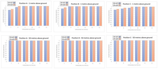 where represents the number of packets correctly received by the gateway, and denotes the total number of packets transmitted within the specified time interval. Throughout the testing process, other critical configuration were kept unchanged in the tabular results, including the following: the spreading factor (SF) was set to 12, the coding rate (CR) was maintained at , and the frequency of operation was set and fixed at 868 MHz. This allowed for a direct comparison of the packet delivery ratio (PDR) across the selected scenarios and for the considered environmental conditions. Then, to further detail the signal behavior, we further varied the LoRa parameters as shown in the bar graphs.