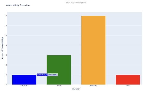 The Figure 3 shows the static examination conducted using Trivy disclosed eleven distinct vulnerabilities in the scrutinized Docker container image. The vulnerabilities were categorized based on their severity: seven of medium concern, three of high concern, and one deemed critical. The most serious issue discovered was linked to libc6 (CVE-2019-1010022), which involves a circumvention of stack guard protection. The Figure 3, generated from Trivy’s JSON results by using a custom Python script, provides an intuitive and immediate visual interpretation of the vulnerabilities, emphasizing their severity and enabling an efficient prioritization for remediation efforts.