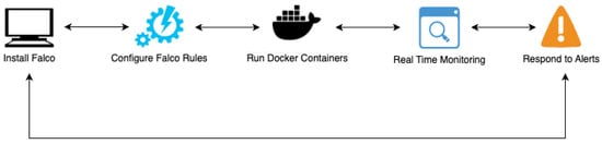 The process flow of the implementation is briefly explained in Figure 4. Dynamic vulnerability analysis complements static analysis by monitoring the runtime behavior of Docker containers. Falco and other tools monitor system calls and activities in real time to detect anomalies, which include unauthorized access or unexpected network connections that would identify and mitigate threats that might be overlooked when using only static analysis.