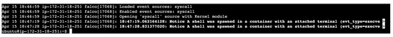 Terminal output showcasing anomalies detected in real time by Falco.