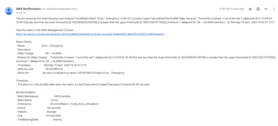 Metrics like error count and success rate were collected (Figure 8) and stored to access the simulation performance. In order to ensure a quick response to possible security threats, CloudWatch alarms were set up to monitor unsuccessful login attempts, and an email notification alert was enabled when a particular thresholds was exceeded. Figure 9 and Figure 10 shows the alarm generated by CloudWatch indicating the failed login attempt and the corresponding email notification that was send.