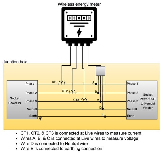 On the other hand, the wireless energy meter is installed at the welding machine using a junction box that ensures a reliable power connection between the electrical socket at the wall and the welding machine’s input power connection. The electrical connections are also made using a 9S/16S four-wire Wye configuration, following the installation guidelines of the industrial meter, where each CT and voltage wire is connected to the appropriate input power phases with an additional ground wire. Figure 3 shows the schematic diagram of the junction box for installing a wireless energy meter.