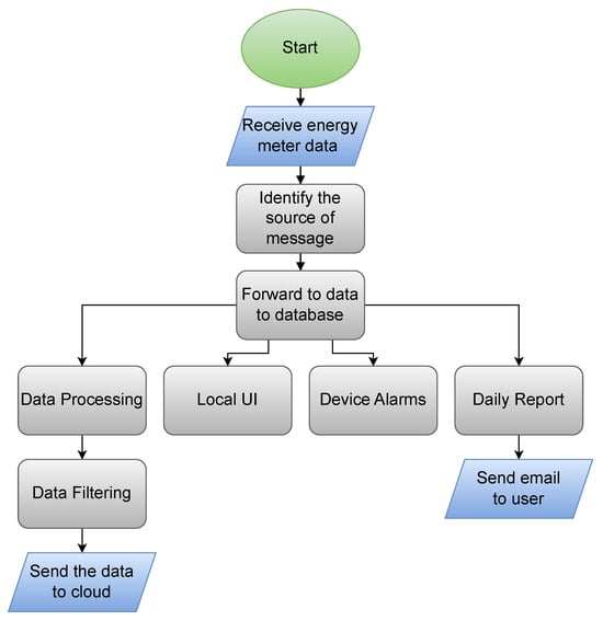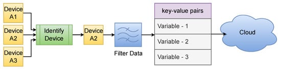 As IoT systems generate and send enormous amounts of data to the cloud, the cost of cloud-backed storage services rises exponentially. In this research, to reduce the number of devices from the cloud, we use a data processing feature at the edge to filter the required data before them it to the cloud by identifying the desired wireless energy metering device and selecting only the essential key-value time series data pairs. Although the edge receives more than 30 energy variables for each meter and then saves them in the local database server, it only sends the wireless meter data with variables mentioned in Table 3. This approach enables the user to monitor the desired data remotely by saving the cost of cloud services. Figure 7 shows the software approach for filtering data at the edge.