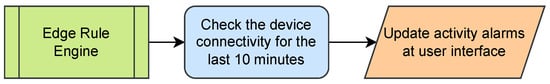 An IoT edge platform brings the cloud computing services closer to the monitoring devices to process the data with low latency and visualize the information with the support of a big database server []. According to Chougule et al. [], executing algorithms directly on the edge devices without relying on the cloud services improves the system efficiency in real time decision-making based on the vast amounts of data with low latency. Moreover, using an edge instance addresses security and privacy concerns along with an offloading feature to adjust the operational load between the local devices and the cloud [].