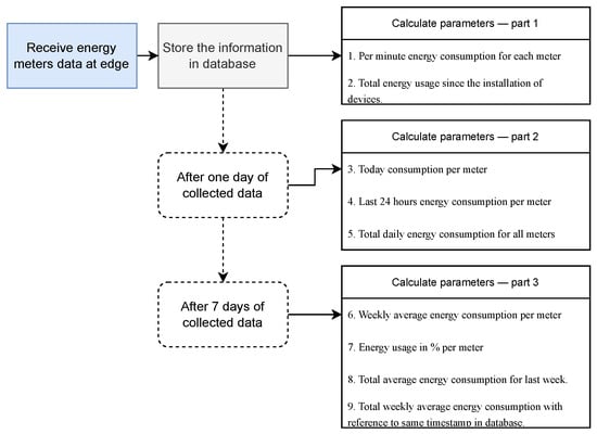 Data processing is the systematic procedure of combining various data collection and preparation frameworks that transform raw data into useful information in numerical, textual, and graphical formats []. In this research, data processing is an essential method implemented at the edge instance of the system architecture to process the energy meter data. A mathematical approach is used to find additional energy parameters based on user feedback for data visualization at the edge and cloud. After the energy meter data are received at the edge, the rule engine identifies the source of telemetry data, forwards them to the respective virtual devices created at the edge instance, and stores them in the database. The data received contain different variables, including the energy consumption value in kWh obtained from both three-phase energy meter types in ascendant value format, which means that with time, the value of the kWh parameter always increases. In the next step, the rule engine feature of the edge calculates energy consumption parameters as identified in Table 3. This section discusses the mathematical approach to finding the energy parameters, including the interval-based data fetching approach to minimize measurement errors due to power or network connectivity events.
