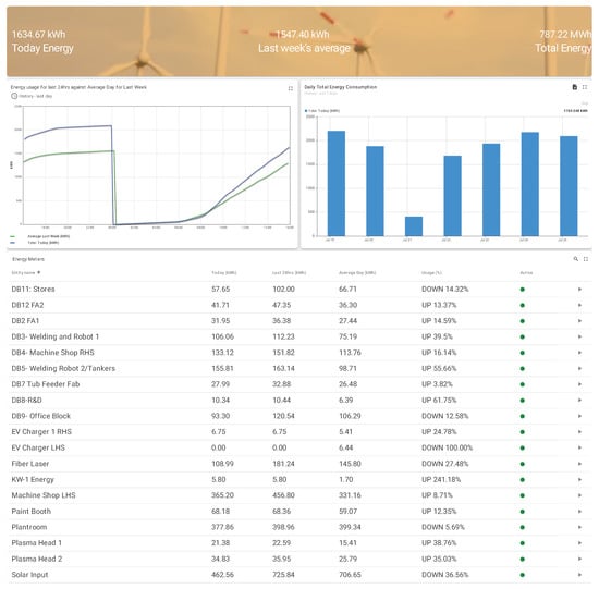 An energy management system is the process of collecting the measured energy consumption data and evaluating their usage to optimize electrical energy consumption. In this context, the industrial products [,] provide a cloud-based customized energy monitoring solution based on the customers’ needs; however, these solutions do not specify the range of features energy monitoring features offered at the user interface.