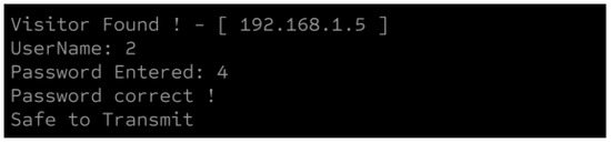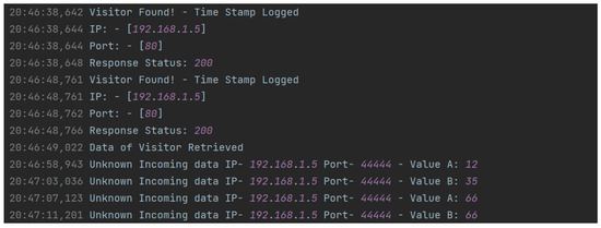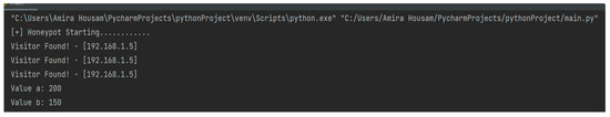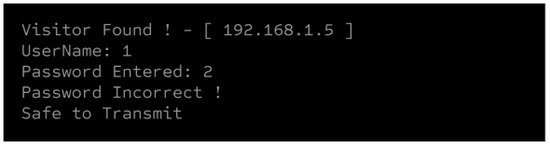 String manipulation techniques were applied to extract the username and password values. Data were retrieved from the HTML page using a socket programming approach that captures and decodes the response from the webpage. String manipulation was then performed on the decoded response to clean and filter data. These logs, generated by the honeypot, record any active connections established with the honeypot. The terminal output first announces that the honeypot is active and logs any device that connects to it within a specified time frame. Subsequently, it logs the values entered on the website, allowing us to track the attacker’s activity on the webpage. The terminal output after entering the data into the webpage is shown in Figure 3.