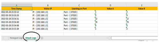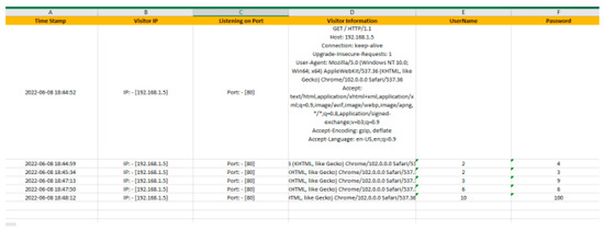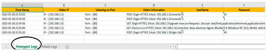 Figure 4 illustrates the Excel spreadsheet “Honeypot Logs” automatically created locally, as previously mentioned. The sheet contains six columns with the following information: