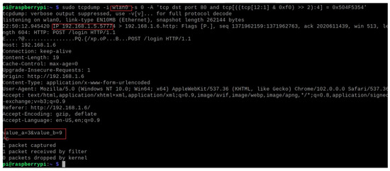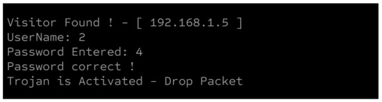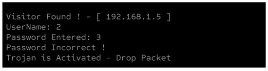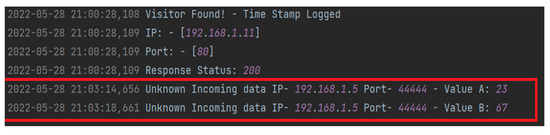 A port packet sniffer is used to log traffic from vulnerable open ports in the system. The TCPdump, a command-line-based sniffer, was employed to gather detailed information about incoming connections. The data captured by the TCPdump can be saved in a .pcap format, which is then imported into data analysis tools such as WireShark for further packet analysis. The collected data from the sniffer was appended to both a logger file and a .xlsx file for convenient access and comparison of the incoming connections across various ports. The last two lines in Figure 6 are added by the sniffer, containing the IP address initiating the connection, the accessed port, and two respective values, A and B. These values serve as the trigger inputs for the HT. Monitoring these values and connections helps mitigate attacks.