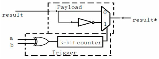 An HT consists of two parts: trigger and payload. The HT is inserted into the original circuit. The user is usually unaware of its existence because the circuit behaves normally most of the time but starts behaving maliciously when the HT is triggered. Consequently, it is not sufficient to protect only the software layer of the device; it is also critical to protect the hardware layer of the device [24].