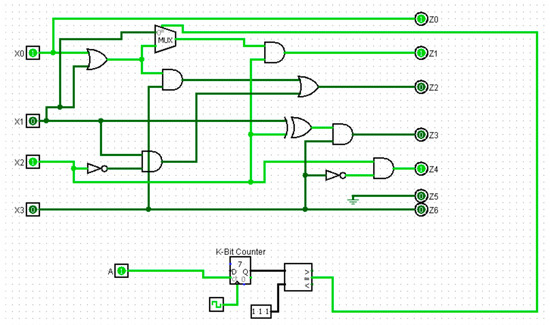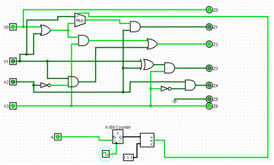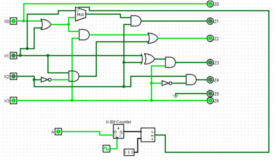 | Output: LEDS, leds ▷ 7-bits binary value Stage 0: Up-Down Counter ▷ controlled by inputs A and B and synchronized with the CLK signal. The counter produces the value count. Stage 1: Comparator ▷ Compare the count value with v Stage 2: Multiplexer ▷ 2-to-1 multiplexer controls the LEDs. Logic Computations: Assign Z = {z0, z1, …, z6} ▷ with the corresponding circuit design Assign LEDS ▷ Z Begin Process #based on count, the corresponding LED segments are activated When count is “000” Activate leds ▷ “1000000” When count is “001” Activate leds ▷ “1111001” When count = “010” Activate leds ▷ “0100100” When count = “011” Activate leds ▷ “0110000” When count = “100” Activate leds ▷ “0011001” When count = “101” Activate leds ▷ “0010010” When count = “110” Activate leds ▷ “0000010” When count = “111” Activate leds ▷ “1111000” Otherwise Activate leds ▷ “1111000” |