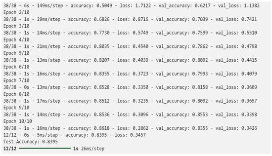 - The output returns two values: test loss and test accuracy. Test loss measures how well the model’s predictions match the actual values in the test dataset. Lower test loss indicates better performance. Test accuracy measures the percentage of correct predictions made by the model on the test dataset. Higher test accuracy indicates better performance. The training output is illustrated in Figure 4.