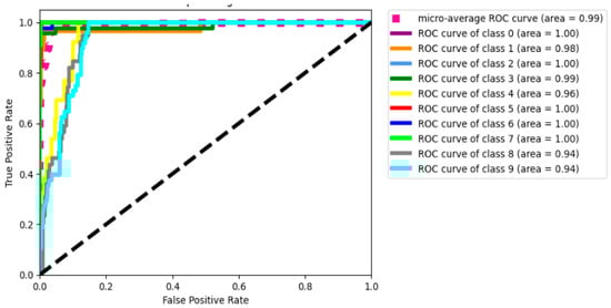 The plot illustrated in Figure 5 provides a comprehensive visualization of the model’s performance in a multi-IoT devices classification setting using ROC curves. It allows for assessing how well the model distinguishes between classes, with the micro-average offering an overall measure. The diversity of colors aids in distinguishing between individual class curves.