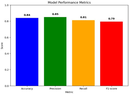 To further substantiate its performance, we calculated additional metrics: accuracy (0.8395), precision (0.8503), recall (0.8117), and F1-score (0.7938). These results are shown in Table 2 and Figure 6. They affirm the classifier’s robustness in achieving high accuracy, precision, recall, and a strong F1-score.