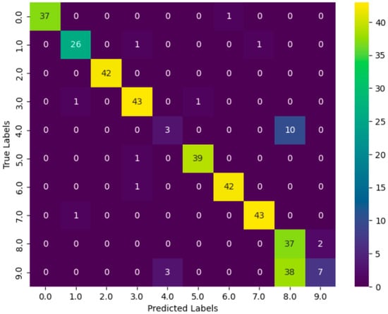The confusion matrix in Figure 7 shows that the model is highly accurate, as most of the predictions are located on the diagonal. For example, the model correctly predicted 37 samples as security cameras (class 0). It incorrectly predicted one sample as a baby monitor (class 6), which was actually a security camera. Looking at another example, the model correctly predicted 37 samples as lights (class 8). It incorrectly predicted two samples as sockets (class 9), which were actually sockets.