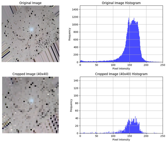To increase the diversity of the images, data augmentation was performed using Keras’s “ImageDataGenerator” class. As shown in Figure 1, the image was randomly rotated within a range of ±40 degrees, introducing rotational variation. It was horizontally and vertically shifted by 20% of its width and height to incorporate slight repositioning. Furthermore, shear transformations were applied to distort the image by zooming randomly by 20%. The image was flipped horizontally to create a mirrored version of the original image, and the nearest pixel value was used to fill any new areas created by these transformations. The results of the augmented image processing can be observed in Figure 1. In this figure, only one sample of the highly stressed images is shown. However, the authors’ previously published work [8] provides a detailed description of the data acquisition technique, as well as the image samples for normal, moderately stressed, and highly stressed conditions. The original images were rotated by 45 degrees in both clockwise and counter-clockwise directions. This rotation introduced artefacts around the edges of the augmented images as illustrated in Figure 2. Furthermore, it was noted that the pixel distributions of the non-cropped augmented images were too similar in range and depth, which could hinder the efficiency of training with the custom CNN. To address this, a histogram analysis of the pixel distribution was performed, highlighting the differences between the cropped and non-cropped images as shown in Figure 2. The goal was to ensure a more diverse and informative feature set for training, thus enhancing the CNN’s ability to generalize from the data. Given the memory and computational constraints of our low-power, cost-effective FPGA, it was crucial to extract as many meaningful features from the dataset as possible. The dataset images, being of low resolution, necessitated the application of specific image processing techniques. To improve the feature extraction process, high-contrast and band-pass filters were employed to increase the pixel distribution levels. These techniques were essential for creating a more distinct feature set and improving the model’s performance. Additionally, methods such as segmentation and masking, as detailed in previous works [23,24,25], were utilized to further refine the feature extraction process. These techniques helped in isolating relevant features from the dataset images, which is vital for effective training on a resource-constrained FPGA platform. The aim was to optimize the image pre-processing pipeline to balance feature richness with the FPGA’s limited computational resources, ultimately achieving a better classification performance.