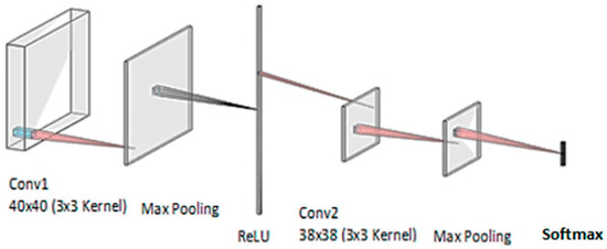 The proposed custom CNN drew inspiration from the modified LeNet architecture, as described in previous work [26]. This CNN was substantially scaled down to fit within the memory constraints of the Basys3 FPGA. The input to the FPGA consists of 40 × 40 pre-processed binary images. These images are processed in banks of 3 × 3 matrices, which slide across the image to perform convolution operations, effectively emulating the convolutional layer (Conv1) depicted in Figure 4. Following the Conv1 layer, a max pooling layer is employed to reduce the number of lower value activations. This pooling operation shrinks the output matrix, preparing it for further convolutional processing in the Conv2 layer, which consists of 38 × 38 matrices to reduce the computational load and memory usage. It was observed that reducing the size further leads to a loss of spatial details and important features. This negatively impacts the model’s ability to distinguish between different classes or detect fine-grained patterns in the image. If the matrix becomes too small, the network might not have enough capacity to learn complex features, which could lead to overfitting if the model becomes too tailored to the training data. The activations and pixel locations are stored in weight matrices, which are updated with each pass of the dataset. A second max pooling layer is applied to further decrease the number of activations, leading to the final classification stage, which utilizes a softmax layer to determine the output categories. The final classification results are categorized into three classes: normal, moderately stressed, and highly stressed. The CNN model was first compiled and tested on a CPU and GPU using MATLAB version 9.12 (R2022a) (https://www.mathworks.com/products/matlab.html). These initial tests provided valuable performance benchmarks, which were subsequently used to guide the HDL synthesis for FPGA implementation.