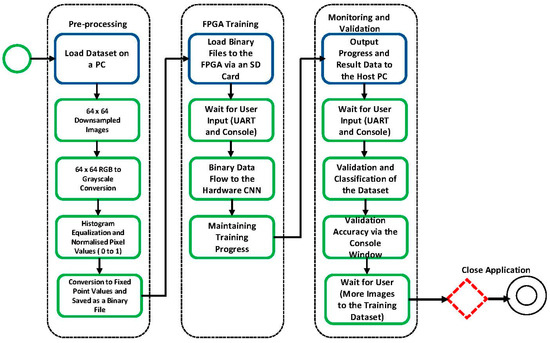 Figure 3 illustrates the overall pipeline for the CNN training process, detailing the flow from the user’s PC to the FPGA. All pre-processing tasks were performed on the client’s PC using custom software, which applies various filters and augmentation procedures to a large dataset. This software converts the grayscale images into 8-bit, 40 × 40 binary images. The converted images are then saved to an SD card, which is inserted into the FPGA. The performance evaluation of the SD card read operation is measured to be approximately 62.5 μs per image. While this does add latency, the impact on the overall throughput is mitigated by pipelining the data transfer process with the FPGA-based CNN inference, ensuring minimal bottlenecks. This additional latency does not impact the overall performance of the inference time needed for classification or training. The FPGA is also connected to the PC and recognized by the custom software. The binary files are organized sequentially, with the class labels aligned with the corresponding images. These files are randomized and fed into the FPGA-based CNN for training. The training process continues until a stopping condition is met, which is determined based on the loss rate during backpropagation. Training halts when the loss rate does not decrease below a specified threshold over five passes of the dataset. The proposed implementation of the FPGA-based CNN focuses on local image processing for medical diagnostics. Future work will expand its integration with the IoT ecosystem. Currently, medical image data are transferred to the FPGA using an SD card, allowing for offline operation. To fully leverage the benefits of the IoT, future work aims to extend the system to include cloud connectivity, enabling seamless real-time data transmission. Cloud-based storage and processing would facilitate remote monitoring and enable the aggregation of medical data, addressing key challenges such as network connectivity, power consumption, and data scalability in IoT environments. This future integration would enhance the scalability, accessibility, and real-time capabilities of the proposed solution, making it more suitable for deployment in a variety of healthcare settings.