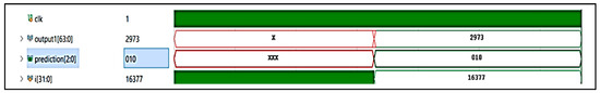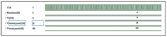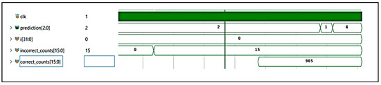 The simulations were conducted using Xilinx Vivado 2021.1, specifically employing its built-in simulation suite to verify functional correctness and evaluate timing metrics. The timing figures were obtained under typical conditions configured in Vivado using post-implementation timing analysis. The simulation results indicate that the average time to classify a single image is 163.795 microseconds, as shown in Figure 7. The output, Output 1, as shown in Figure 7, displays the number of activations computed, which were subsequently processed by the softmax layer to produce the final classification result. This specific output corresponds to a healthy sample. The input arrays consisted of values fed into the FPGA from binary files, which were converted from pre-processed grayscale images. Backpropagation methods were evaluated by testing the CNN with 1000 samples from each category: highly stressed, moderately stressed, and normal. In total, there were three output classes (normal, moderately stressed, and highly stressed) where backpropagation was used to help manage the complexities of the learning process by systematically updating weights throughout the network, ensuring that each layer contributed effectively to the learning process. Figure 8, Figure 9 and Figure 10 illustrate the simulation results, showing both correct and incorrect classifications of the dataset images. As shown in Figure 7, “output1” is the fully connected layer’s final value, “prediction” is the predicted class, and “clk” represents the base clock. Figure 8 shows the correct counts value, which represents the number of correctly predicted samples. This test shows the accuracy of the highly stressed image classification samples, where 97.5% accuracy was achieved. Figure 9 shows the classification performance of the moderately stressed samples. The correct counts were measured at 985, which equates to 98.5% accuracy, while Figure 10 shows the classification process of normal samples. The correct counts’ waveforms changed consistently during the classification process, incrementing after each successful prediction. As shown in Figure 10, an 86.4% accuracy was achieved, which translates to 864 out of 1000 normal samples classified correctly.