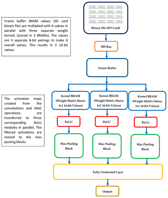 As shown in Figure 11, the parallelization design approach involves the custom CNN’s implementation on the FPGA device. It involves the input of binary data from the SD card into the FPGA CNN classifier. The binary file data are transferred via a 3 × 1 matrix of 16-bit values split into six 8-bit values (as input data) and are multiplied by the contents of the kernel BRAM weights. The binary files are reconstructed to match the behaviour of a convolution shift after each forward pass. This was accomplished to reduce the number of logic gates used where extra resources would be needed to create a separate module to perform convolutions. Data are shifted sequentially, six values simultaneously at a time, into the classifier module’s input. These values are multiplied by the weights in the kernel BRAMs. The outputs from these MAC operations are transferred to the respective ReLU modules for each activation map generated. The filtered activations are passed on to the max pooling modules to further reduce most activations into smaller resolution tensor maps. These are finally passed to the fully connected layer, which determines the final classification output class. The FPGA logic diagrams are shown in Figure 12 and Figure 13, respectively.